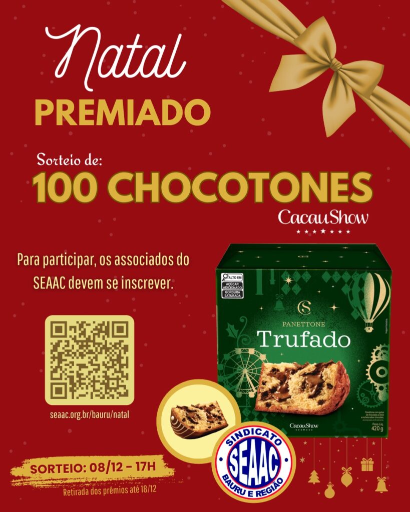 Atenção, associados! O sorteio dos 100 Chocotones Cacau Show serå realizado no dia 08 de dezembro, às 17h.
