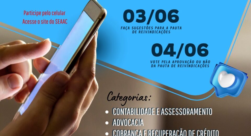 🗓️ Categorias com data-base em JULHO e AGOSTO 📢 O SEAAC convoca todos os trabalhadores e trabalhadoras para participarem da assembleia virtual nos dias: 🗓 03 e 04 de junho⏰ Das 8h às 20h 💻 Acesse o link : https://seaac.org.br/seaac/virtualago/index.asp?sea=59996553 Vamos deliberar sobre: 📌 Reajuste salarial 📌 Condições de trabalho 📌 Pauta de reivindicações 📌 […]