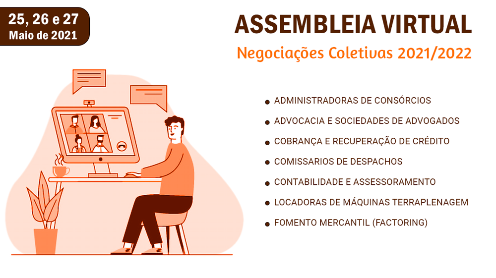 Entre os dias 25 e 27 de maio, o SEAAC realizará a coleta de propostas e fará a deliberação das pautas de reivindicações dos trabalhadores e trabalhadoras para as Negociações Coletivas de 2021/2022, das Categorias de Advocacia, Administradoras de Consórcios, Assessoramento e Contabilidade, Cobrança e Recuperação de Crédito, Comissários de Despachos, Locação de Máquinas e Equipamentos de Terraplenagem, Sociedades de Fomento Mercantil – Factoring.