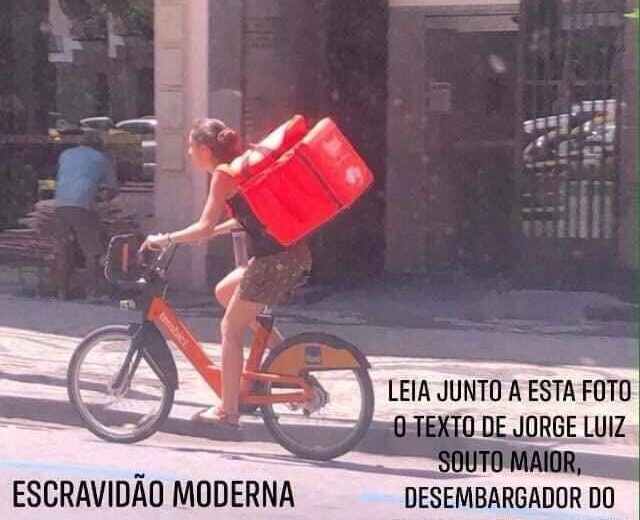 Nesta foto vemos uma jovem pedalando sem capacete, sem nenhum vínculo empregatício e sem nenhum direito trabalhista entregando comida de um restaurante que não é onde ela trabalha para alguém que a pediu por um aplicativo milionário que também não é onde ela trabalha. Usando uma bicicleta que não é sua e pela qual ele […]