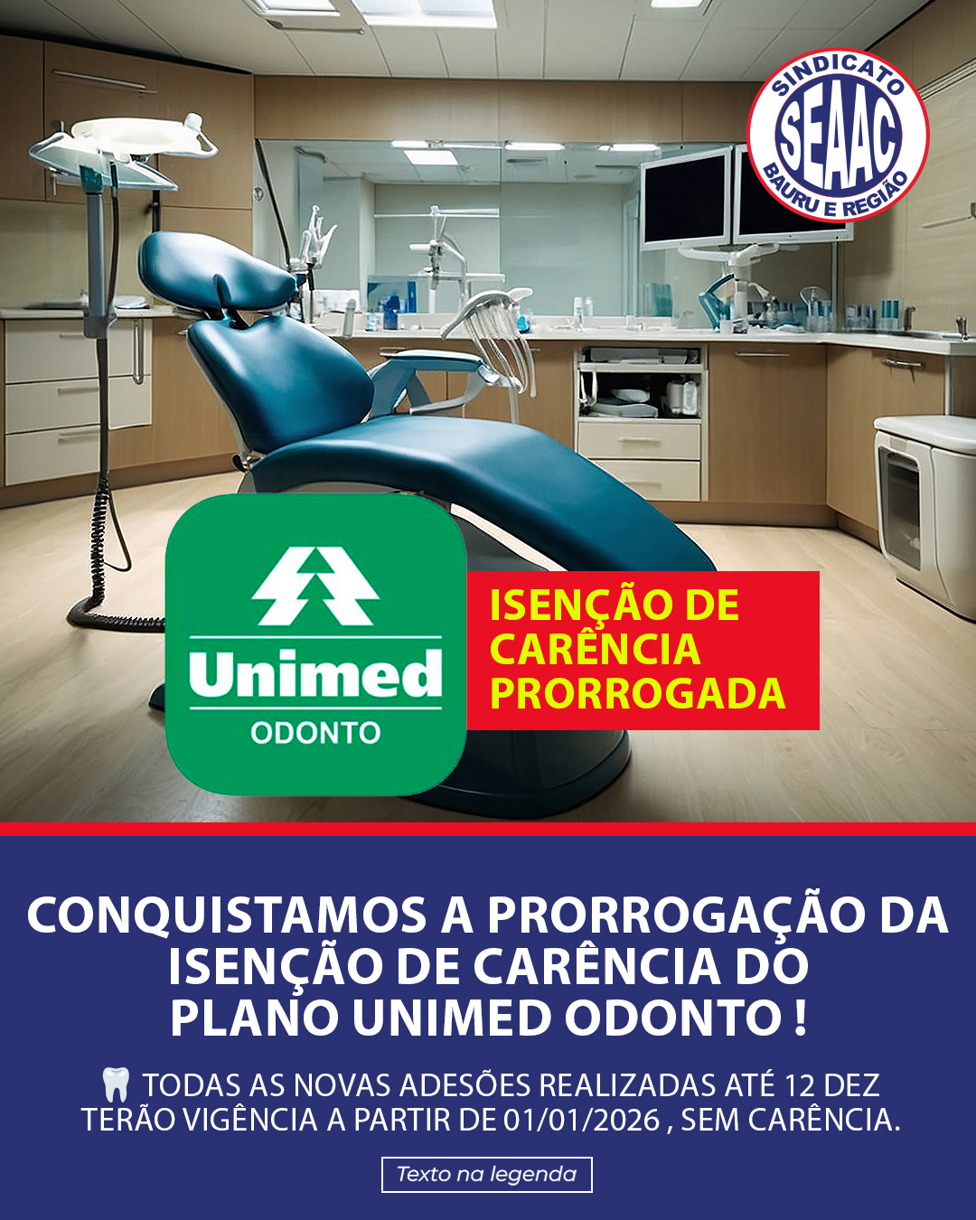 Em Destaque 🦷 BOA NOTÍCIA PARA OS ASSOCIADOS DO SEAAC! Plano Odontológico... Conquistamos a prorrogação da isenção de carência do Plano Unimed Odonto !Agora, todas as novas adesões realizadas até 12/12 terão... BY agenciasomma novembro 26, 2025 0 Comment