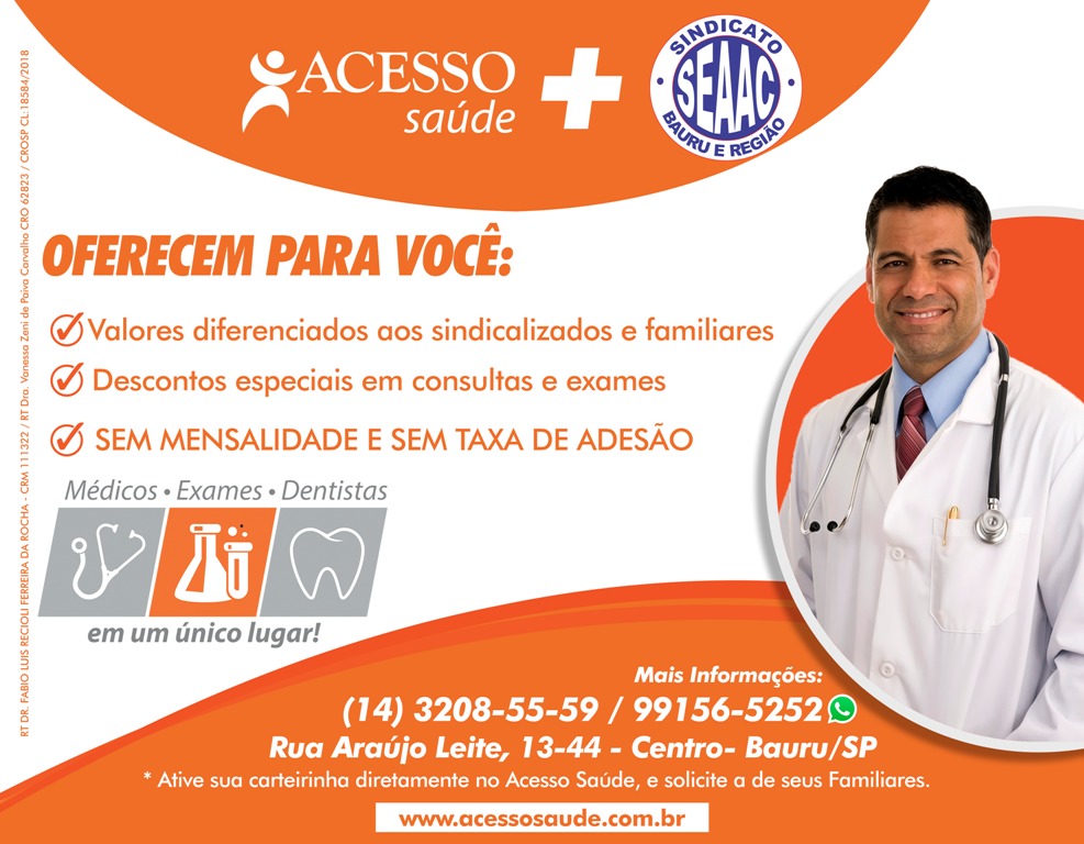 Fique Ligado Parceria Acesso Saúde: consultas sem mensalidade ou taxa de adesão O SEAAC firmou nova parceria com a Acesso Saúde, que atenderá o(a) associado(a) e dependentes: cônjuge, filho, pais, irmãos, sogros... BY agenciasomma junho 14, 2018 0 Comment