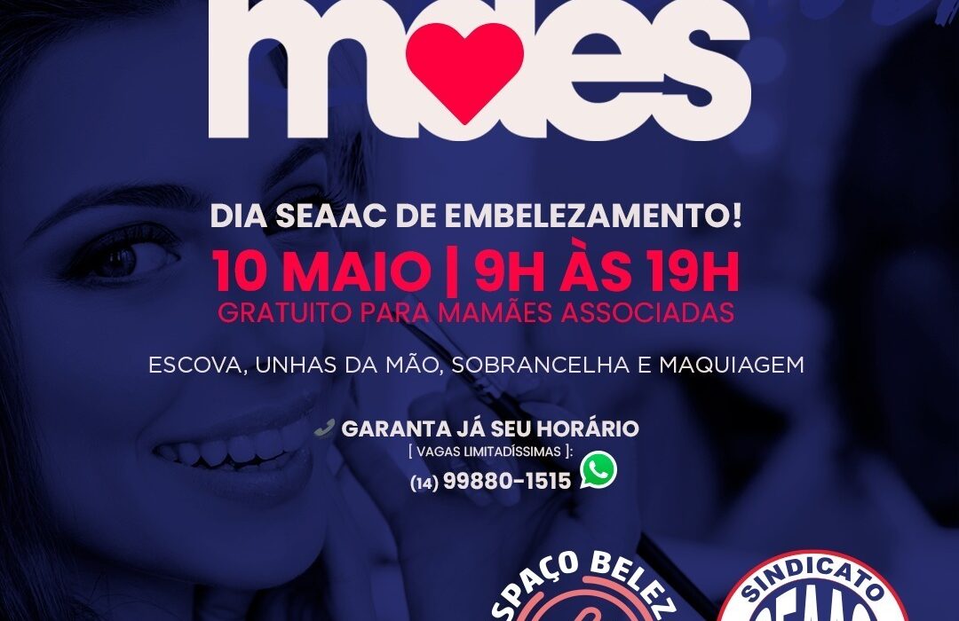 Atenção associados e associadas ao Seaac! Em comemoração ao Dia das Mães, o sindicato oferecerá procedimentos de beleza gratuitos para as mães e mães de associados ao Seaac em 10 de maio. Nesta data, das 9h às 19h, o Espaço Beleza, localizado em nossa sede, oferecerá sem custo algum escovas, manicure, designer de sobrancelhas e maquiagem para o embelezamento das nossas rainhas.